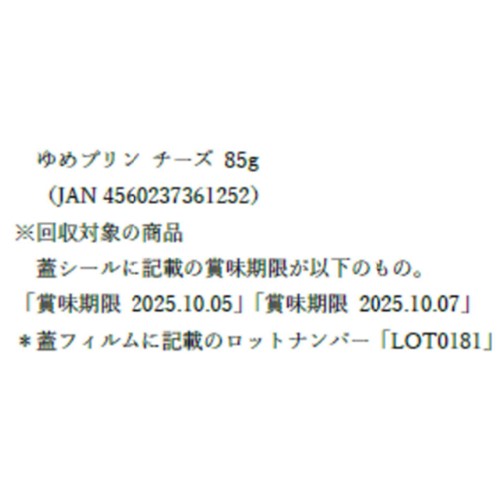 おおのミルク工房「ゆめプリン~チーズ~」 - 返金/回収