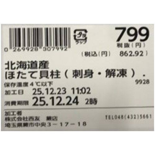 西友「北海道産 ほたて貝柱(生食用・解凍) 」(東京都、神奈川県、千葉県、滋賀県の西友店舗で販売) - 返金/回収