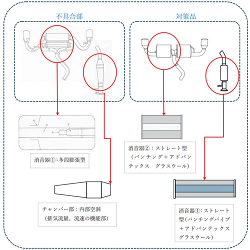 近接排気騒音値が基準値を超過し保安基準に適合しないおそれ、出力低下が生じるおそれがあるため
