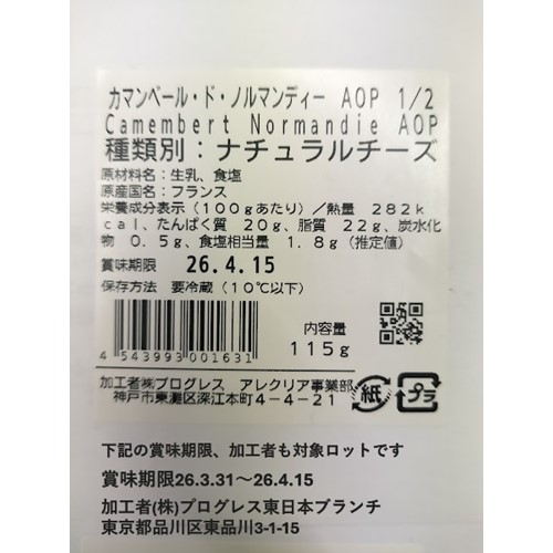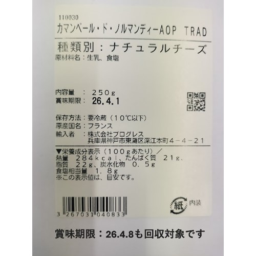 プログレス「ナチュラルチーズ:カマンベール・ド・ノルマンディー AOP TRADITION 250g、同 AOP 1/2カットP」 - 返金/回収