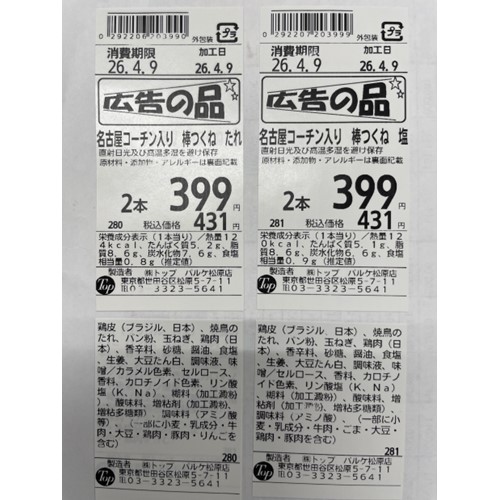 トップ(東京都、神奈川県の店舗)「名古屋コーチン入り棒つくね」 - 返金/回収